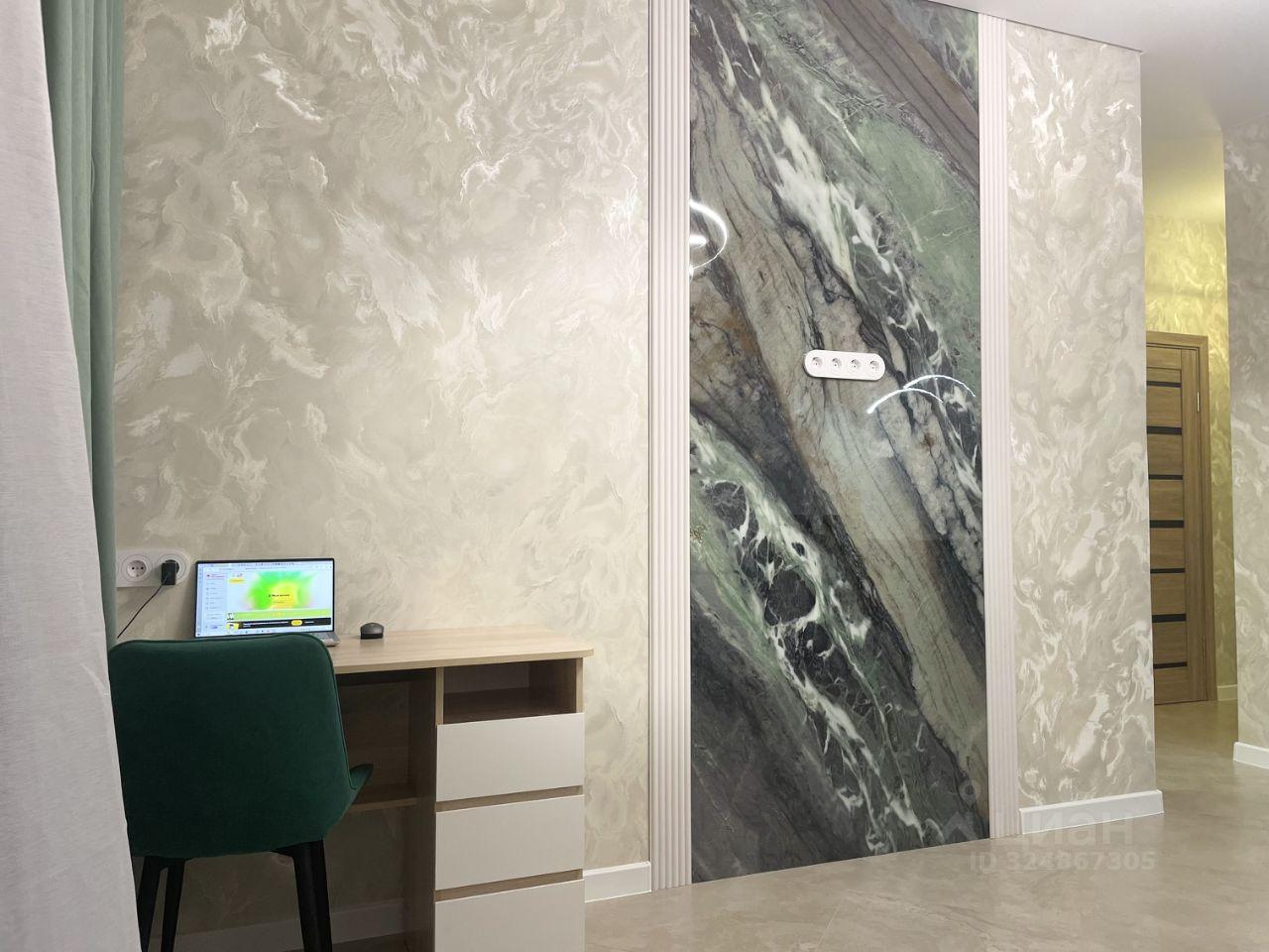 Общая площадь квартиры составляет 38,8м2, комната, кухонная зона с гостинной. Выполнен ремонт по эксклюзивному дизайн-проекту. В отделке использовались только качественные материалы: на полу ламинат и керамогранит; в санузеле керамогранит, скрытые двери высотой 240см.