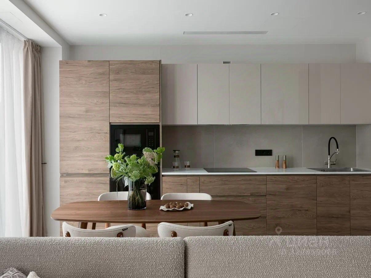 Кухня оборудована всем необходимым: фильтром для воды, посудомоечной машиной, варочной панелью, духовым шкафом, микроволновкой, холодильником, вытяжкой, посудой и приборами.