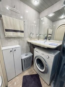 Совмещенный санузел с системой тропический душ, стиральной машиной и вместительным шкафом для хранения. Для удобства уже есть средства для уборки (швабра с отжимом, совок и щетка), а также утюг и складная гладильная доска, напольная сушилка для белья, беспроводной пылесос (с дополнительной насадкой для мебели).