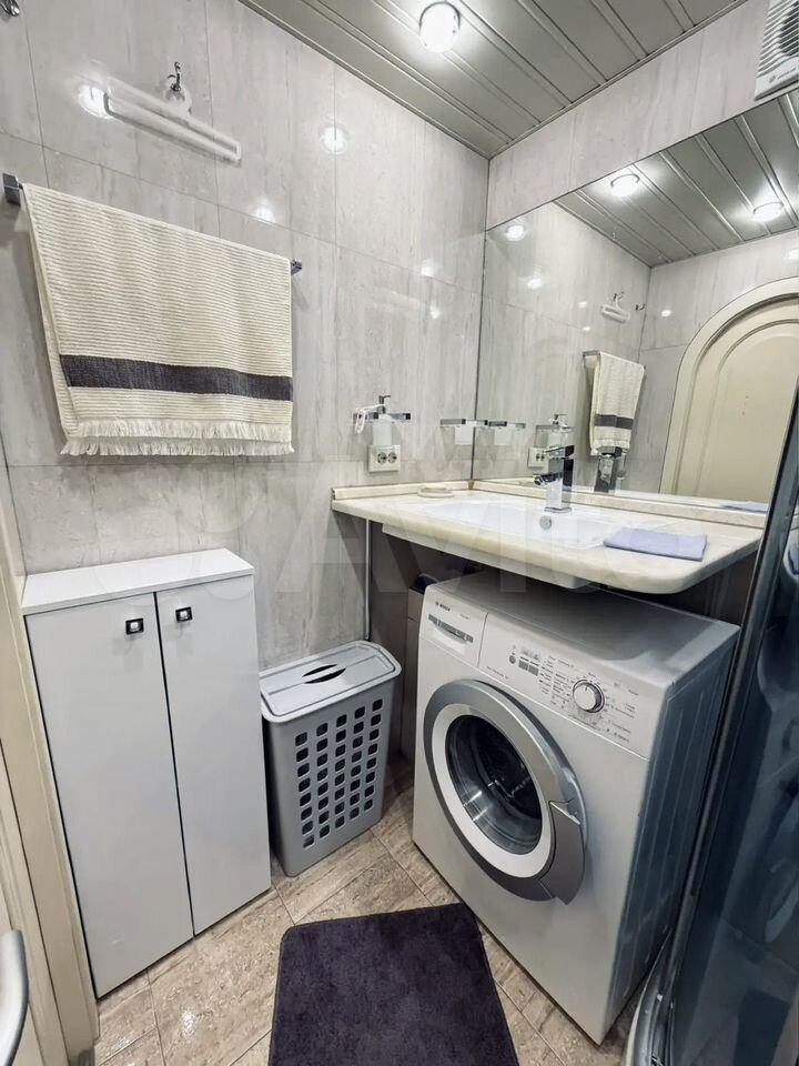Совмещённый санузел оборудован душевой кабиной и стиральной машиной. Из окон открывается впечатляющий вид на город. В доме три пассажирских и один грузовой лифт, а также подземная парковка. Если вы с машиной, также можем обговорить под сдачу подземный паркинг.