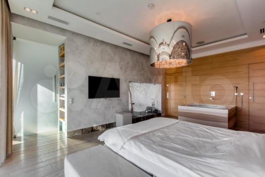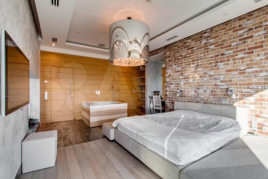 Пространство спальни с кроватью, шкафом и тумбочками отделено от гостиной и кухни: находится на 2м этаже. Высокие панорамные окна (4,5 метра) украшают интерьер.