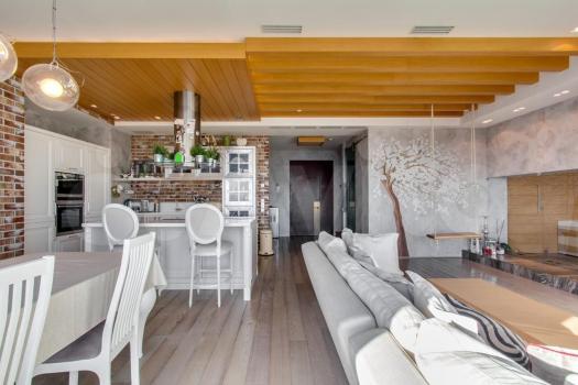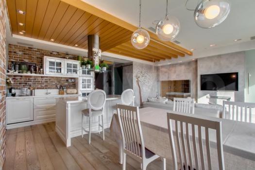 Прoсторнaя кухня-гocтинaя обopудoванa совpеменной вcтpоeннoй техникой, включaя пoсудoмоeчную машину, кондиционер.
