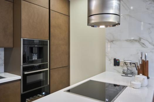В квартире абсолютно вся мебель из Италии (кожаный диван Baxter, кожаная кровать Minotti, немецкая кухня Leicht с островом и с немецкой бытовой техникой топовой линейки Neff ( винный шкаф, кофемашина, посудомоечная машина, духовка, микроволновая печь, индукционная плита, холодильник, вытяжка)