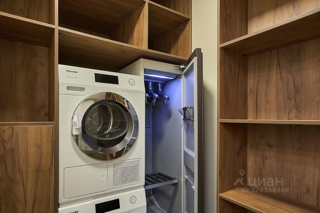 В квартире есть отдельная гардеробная комната с системой хранения и отдельная постирочная комната с системой хранения где в колонну установлена стиральная машина и сушильная машина типовой линейки Miele, паровой шкаф Samsung.
