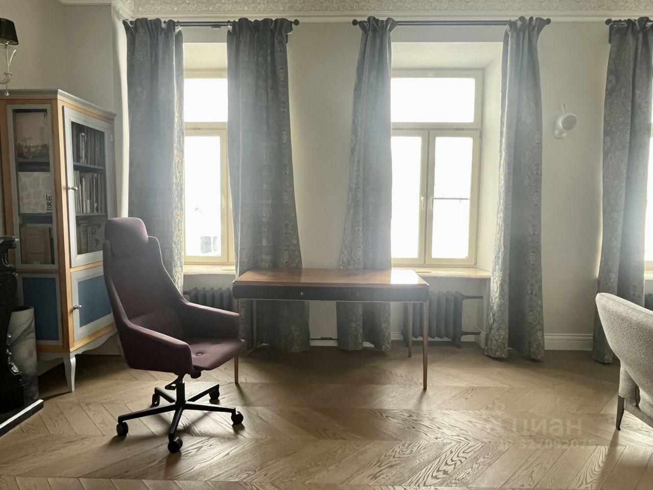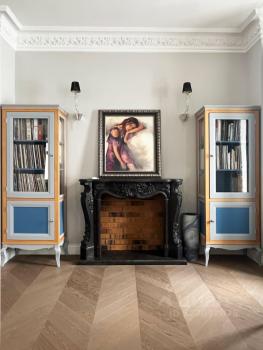 Правильная геометрия, высота 3,40 м, декоративный каминный портал из чёрного мрамора. Пространство позволяет комфортно зонировать зону отдыха и рабочую часть.