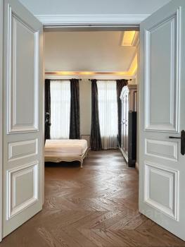 Во всей квартире, кроме санузлов, уложен массив дуба Coswick с укладкой французская ёлка крупного формата. Межкомнатные двери — индивидуальный заказ, массив дуба. Подоконники — мрамор (Италия). Окна дерево-алюминий с тройным стеклопакетом. В помещениях установлены декоративные чугунные радиаторы.
