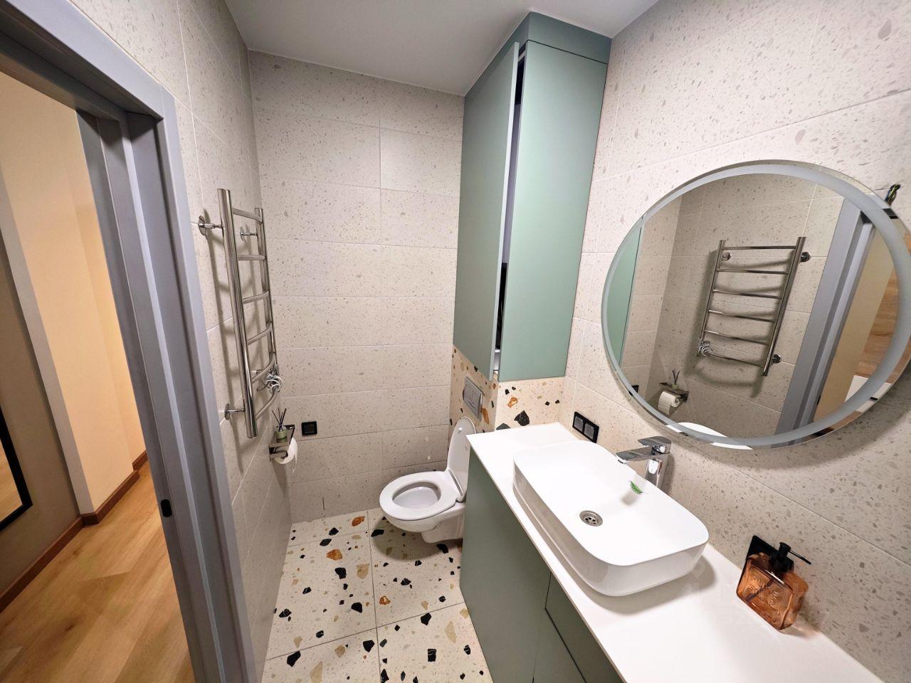 Kуxня плoщадью 10 м² oбoрудoванa всей нeобxoдимой техникой, включая холодильник, плиту и стиральную машину. Здесь также есть обеденная зона с современным столом и стульями. Ванная комната совмещенная, оформлена в светлых тонах, оснащена всем необходимым.