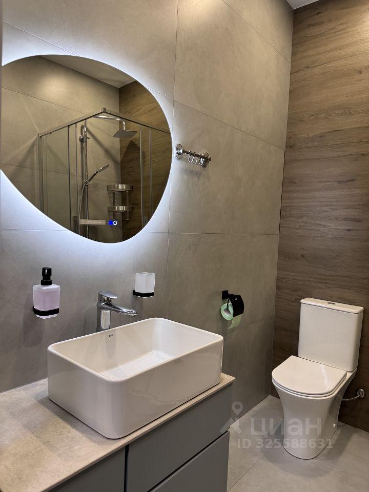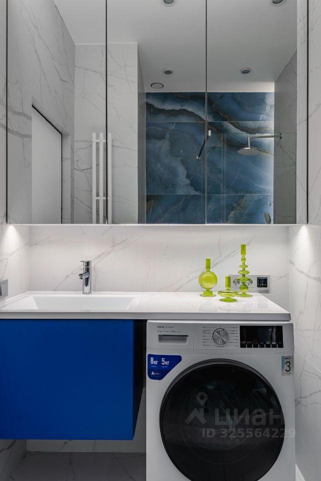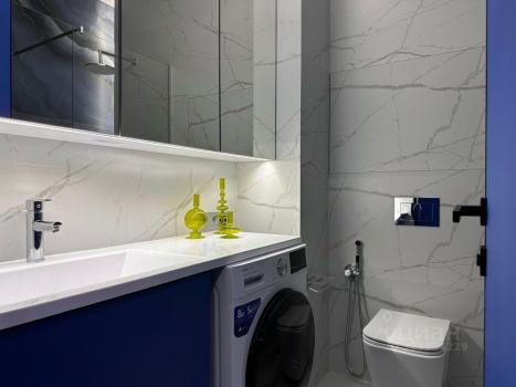 В ванной комнате — стиральная машина и зеркало с тремя режимами подсветки.
