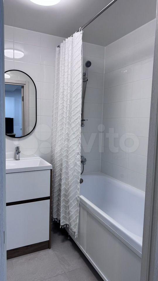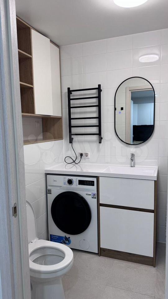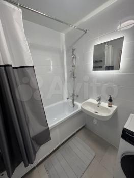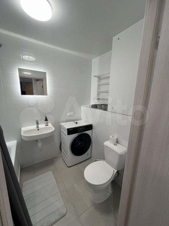 В квартире есть всё необходимое для комфортного проживания. Просторная комната обставлена мебелью, а на кухне установлена новая техника: кондиционер, холодильник, посудомоечная машина. Санузел совмещённый, установлена стиральная машина с сушкой.