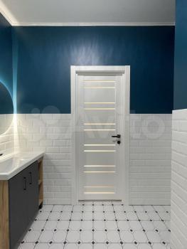 Ванная комната: подвесная тумба с двумя отсеками, настенная полка, зеркало с подсветкой настенное, стиральная машина, ванная.