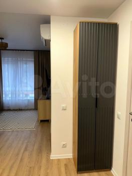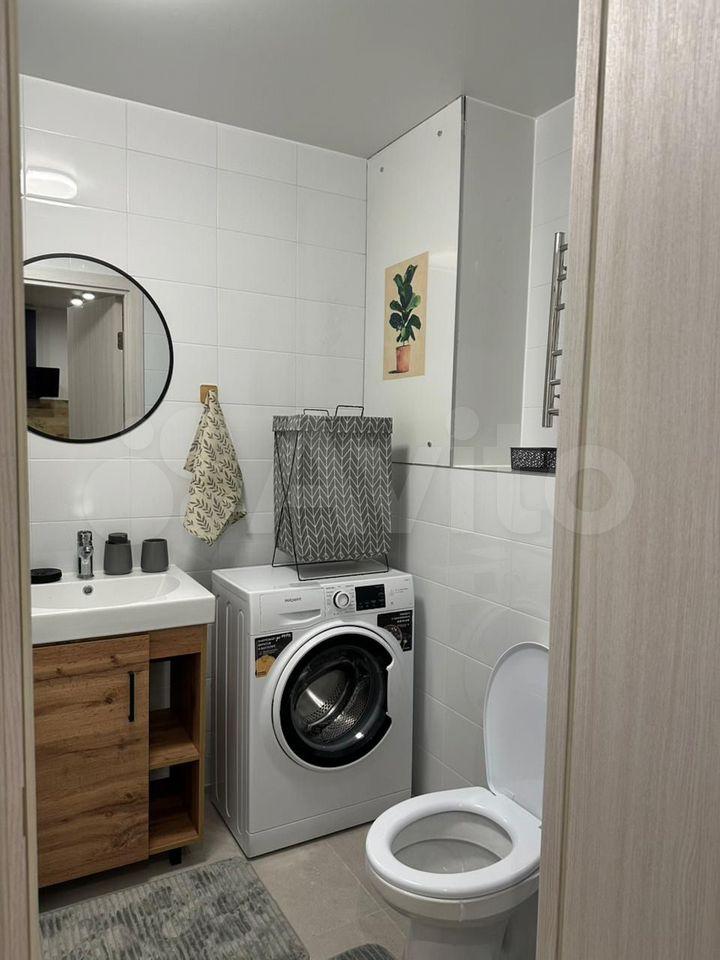 Жилая комната оборудована удобной кроватью и вместительным шкафом. Из мебели также имеется обеденный стол и стулья. В санузле установлена стиральная машина и полотенцесушитель. Есть роутер, робот-пылесос, утюг,гладильная доска и сушилка.