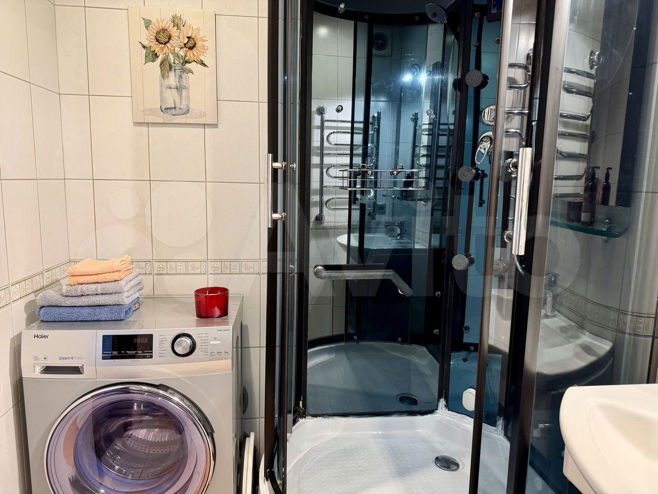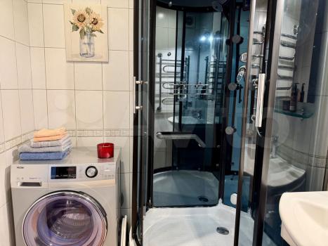 Квартира полностью готова к комфортному проживанию: в комнате и на кухне есть вся необходимая мебель. Техника включает холодильник, телевизор и стиральную машину. Санузел совмещённый, оборудован современной душевой кабиной.