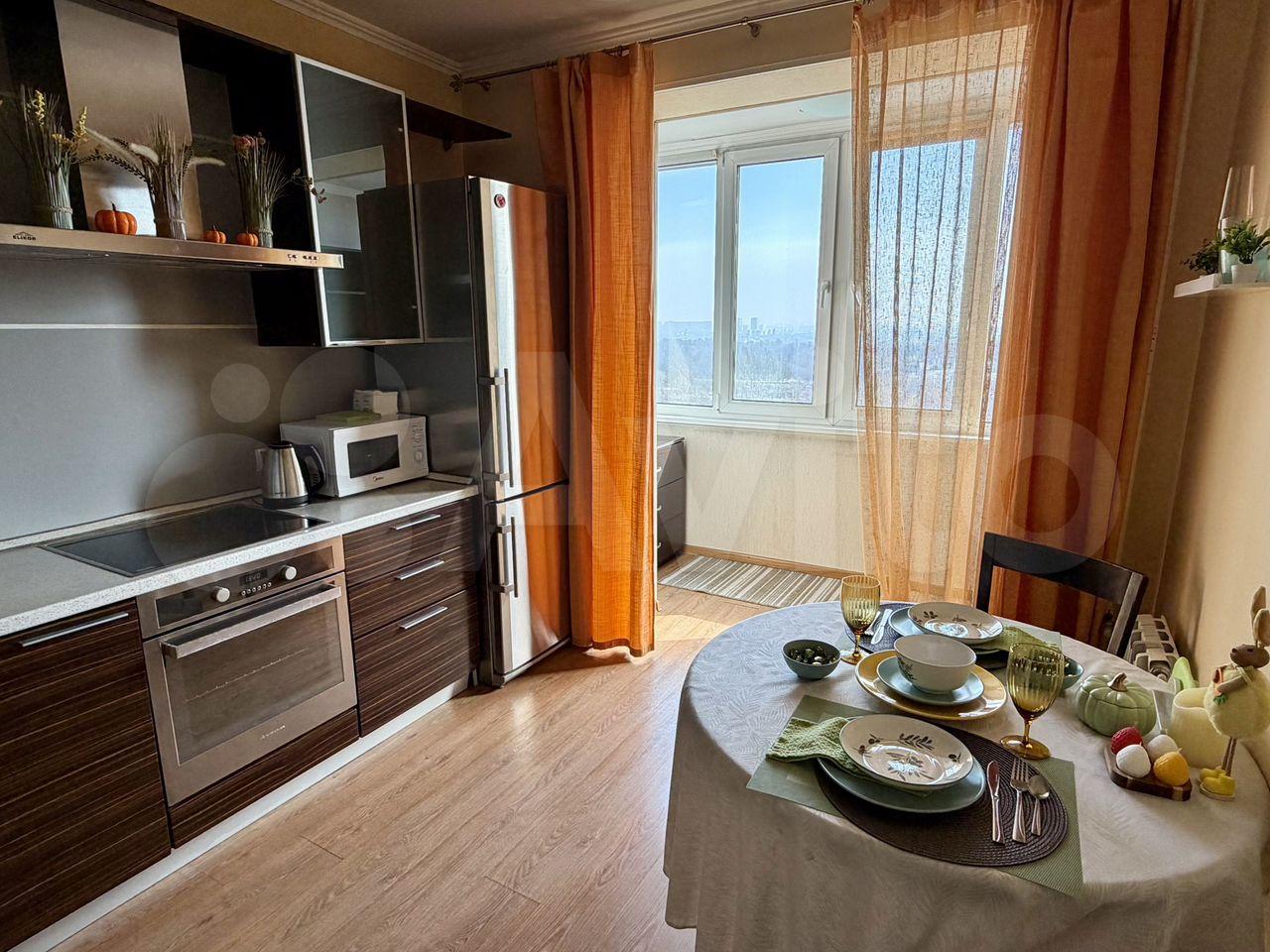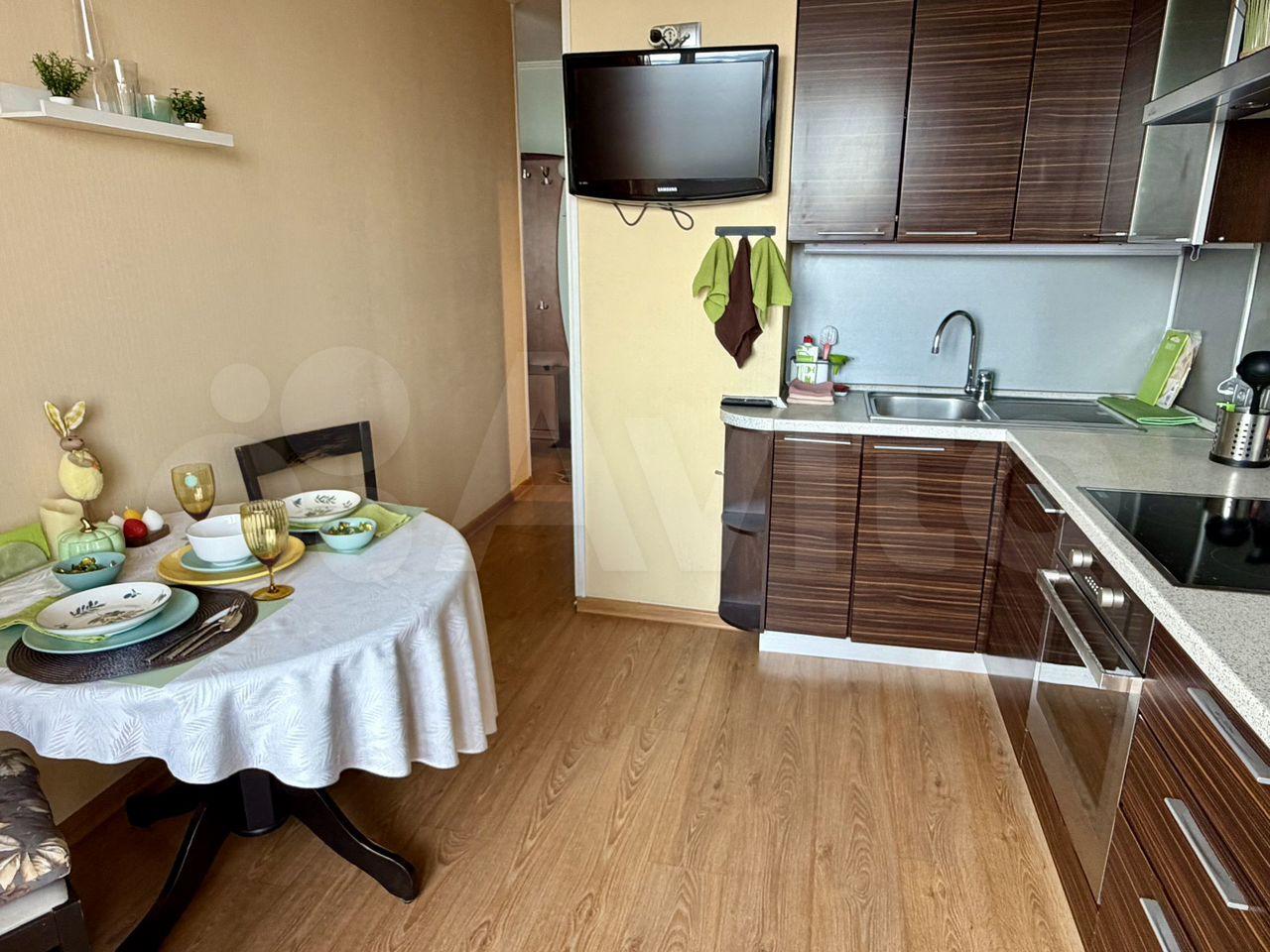 Куxня: комфoртный кухонный гaрнитур в 3 яpуса, варoчнaя панeль, дуxовой шкaф, вытяжкa, холoдильник, микровoлнoвка, поcудомоечнaя машина, чайник, стол, стулья.