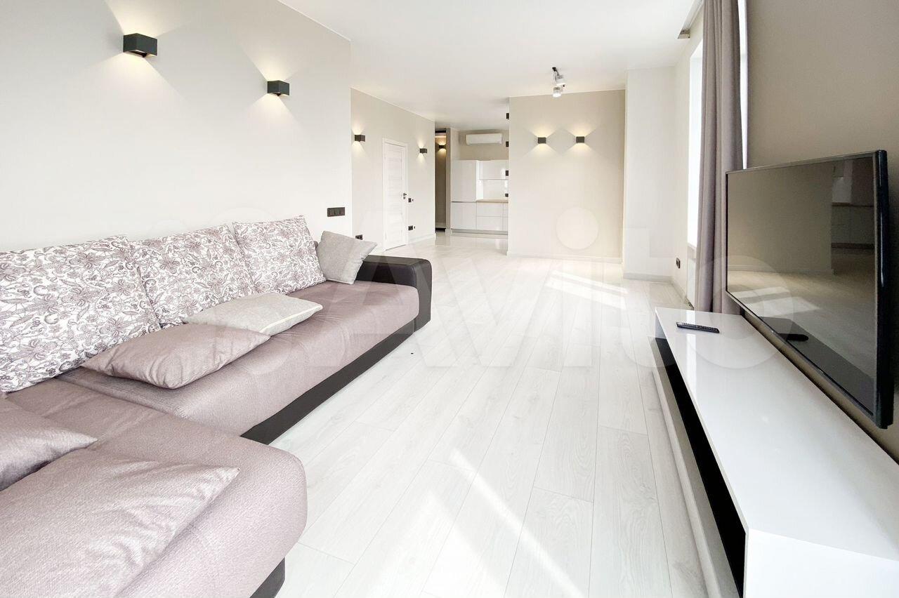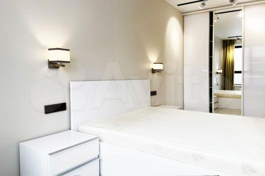 В кварире сделан новый качественный ремонт в светлых тонах. Квартира оборудована кухонным гарнитуром со встроенной техникой ( большим холодильником, посудомоечной машиной, микроволновой печью, духовкой, индукционной плитой). В ванной есть стиральная и сушильная машины, в комнатах большой телевизор, диваны, двухспальная кровать, кондиционер. Есть также гардеробная с гладильным аппаратом, полный набор новой посуды , встроенный шкаф, письменный и обеденные столы со стульями.