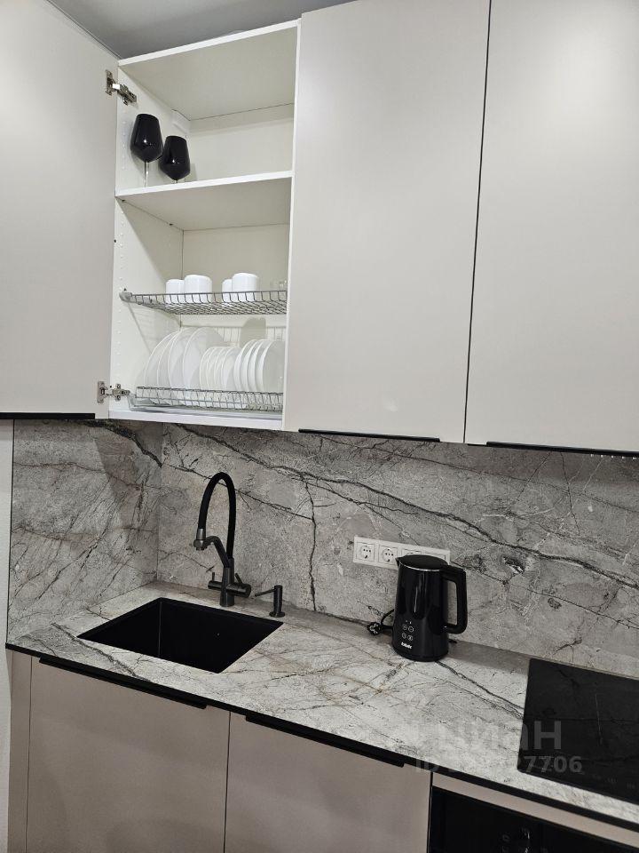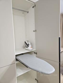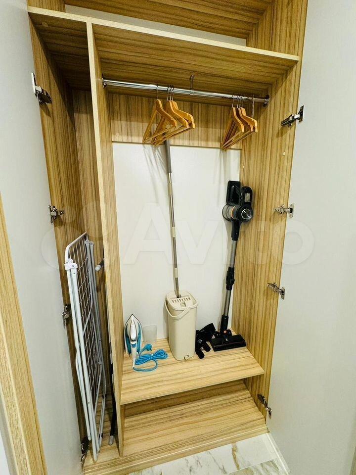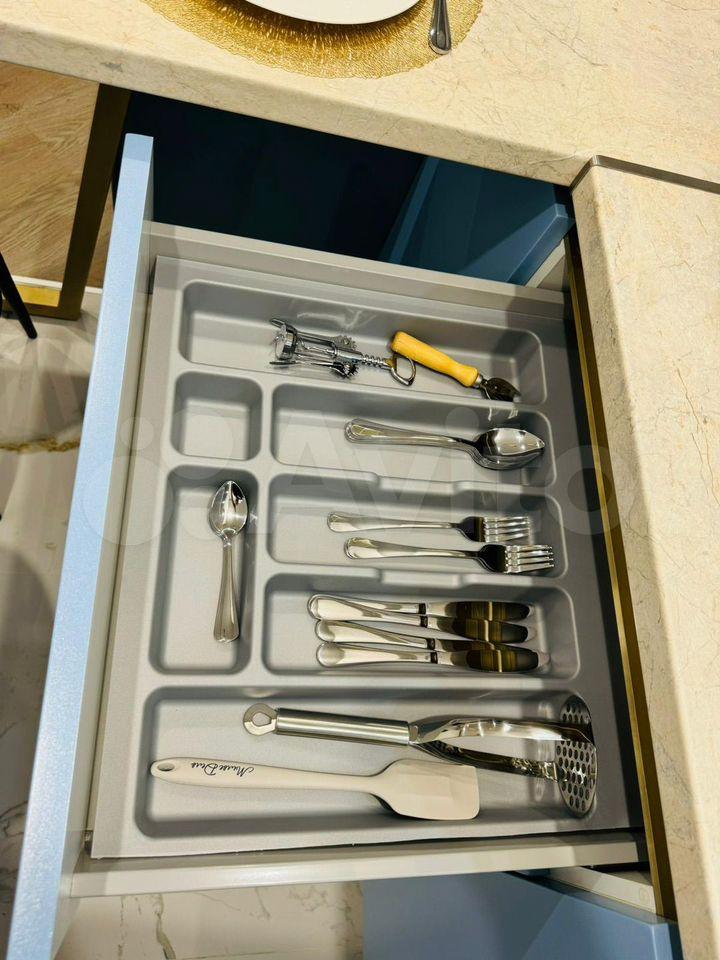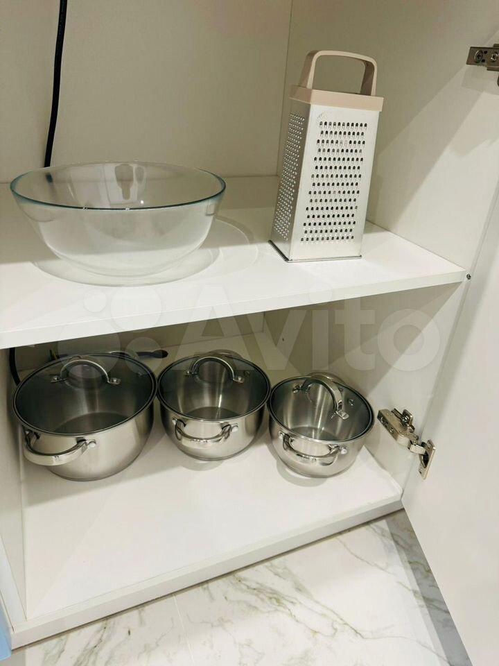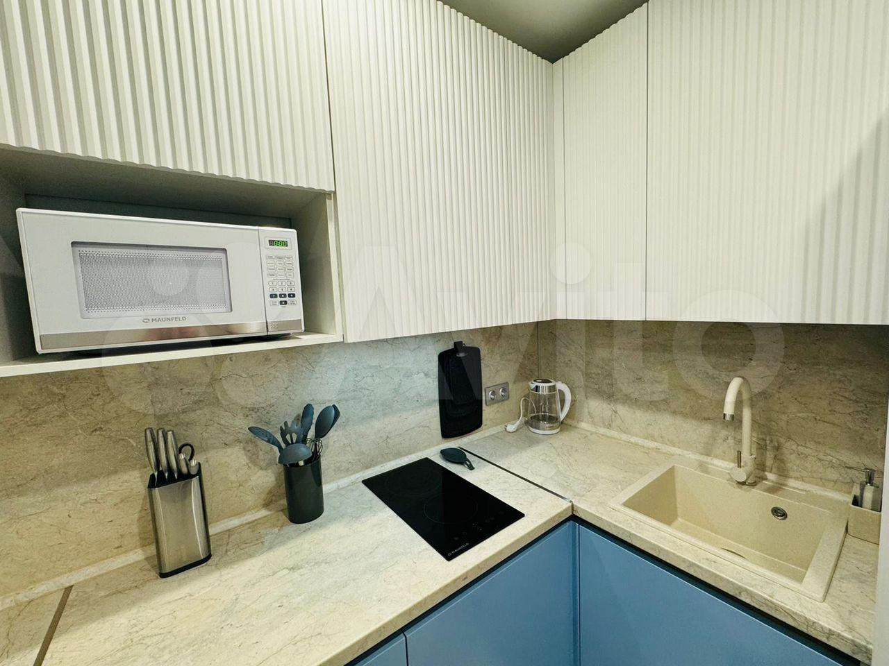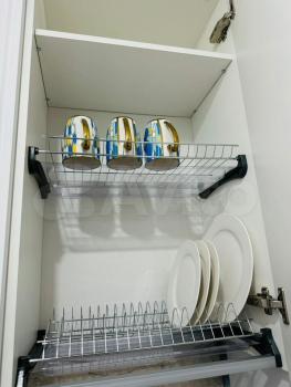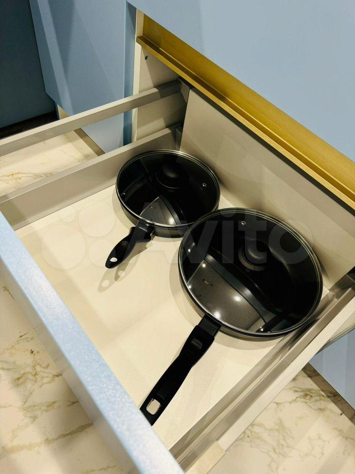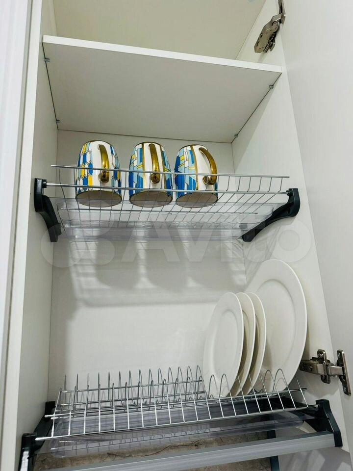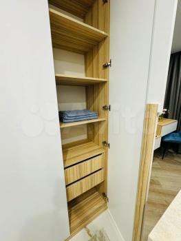продуманная кухонная зона, много мест для хранения. В квартире есть все необходимое: кровать с подъемным механизмом и ортопедическим матрасом, посудомоечная машина, холодильник, СВЧ, чайник, фильтр