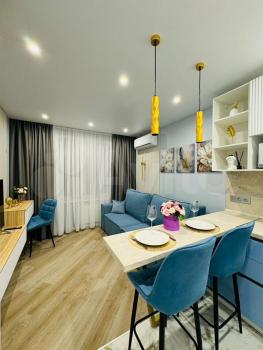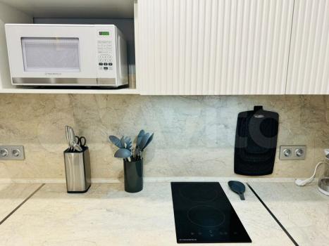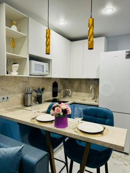 Квартира выполнена с дизайнерским ремонтом, что делает ее стильной и комфортной для проживания. В просторной студии есть вся необходимая мебель как на кухне, так и в комнате. Ванная комната оборудована ванной. Из техники в вашем распоряжении будут кондиционер, холодильник, посудомоечная машина, телевизор и стиральная машина — все для вашего удобства.