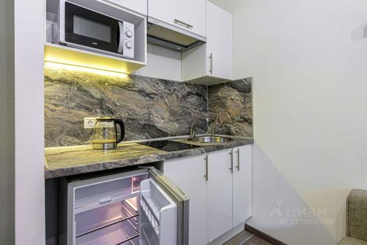 Студия полностью меблирована: кухонный гарнитур, кровать 140на200, холодильник, телевизор, сплит-система, стиральная машина с сушкой.