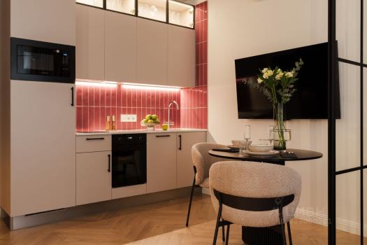 - Бытовая техника в зоне кухни (индукционная плита, микроволновка, холодильник, посудомоечная машина);