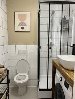 - С/У: душевая стойка, стеклянная перегородка, зеркало, стиральная машина, полотенцесушитель.