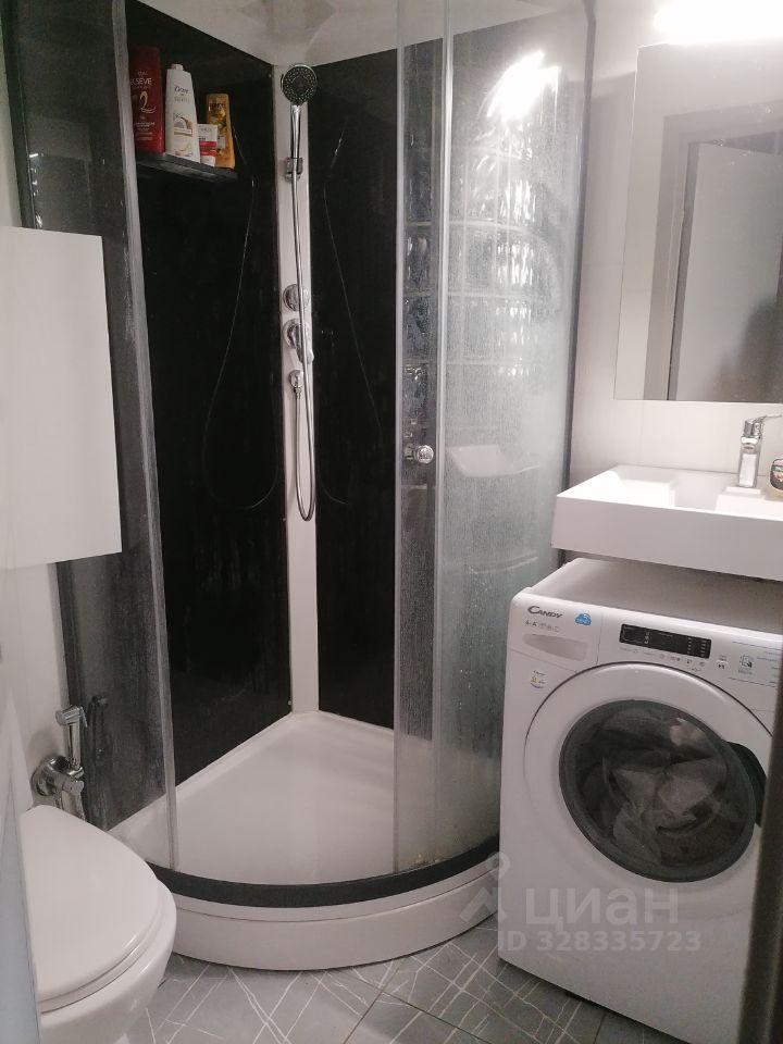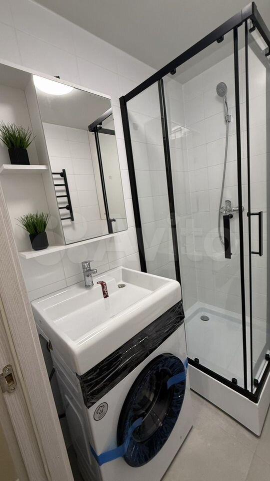 В санузле душевая кабина , корзина для белья , стиральная машина и сушилка оборудована к стене ( подвесная)