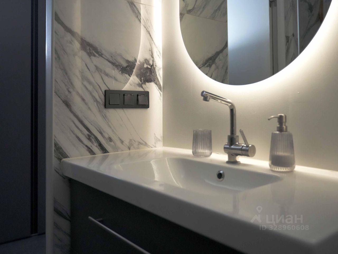 — Зеркало с подсветкой, два подвесных шкафа.