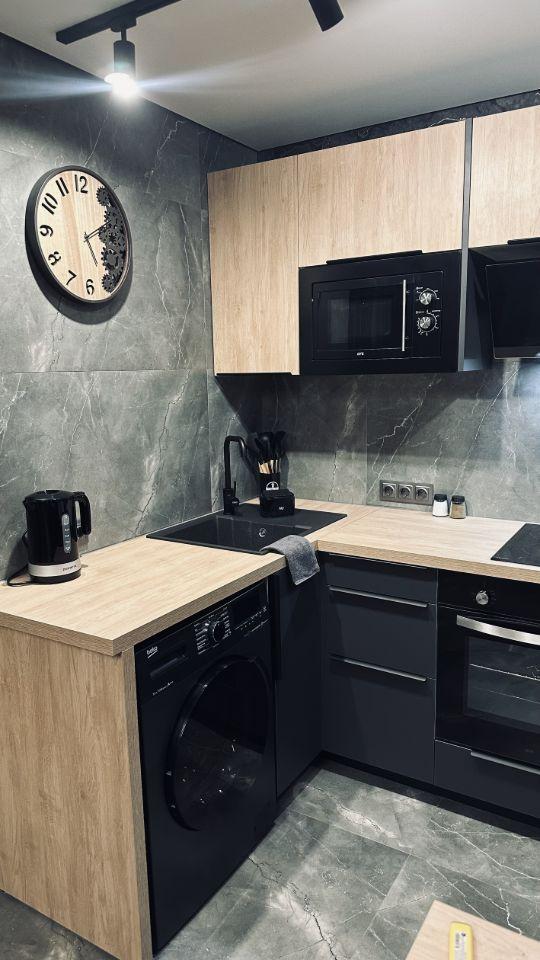 - Встроенная кухня с варочной панелью, посудомойкой, вытяжкой; микроволновка, холодильник,