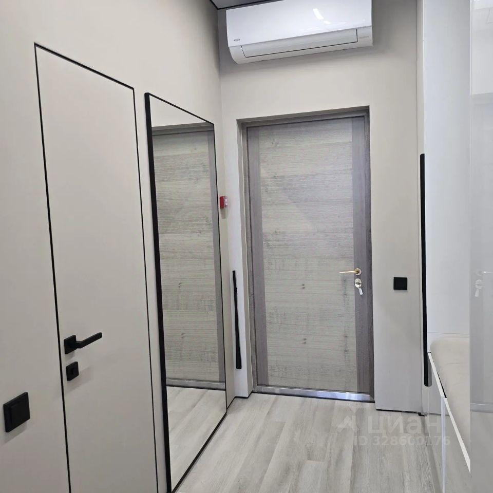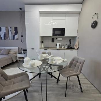 Студия, площадью 27 кВ. м, включает в себя уютную комнату, совмещенную с кухней и обеденной зоной, функциональную ванную комнату. Из мебели кухонный гарнитур и обеденный стол на 3 персоны, двуспальный раскладной диван, напротив которого расположена тумба с плоским телевизором. В коридоре расположен вместительный шкаф с зеркальной поверхностью. В совмещенном санузле есть душевая кабина и стиральная машина.