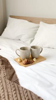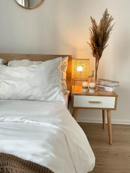 Есть зона для сна- двухспальная кровать с ортопедическим матрасом и высоким изголовьем, прикроватная тумба.