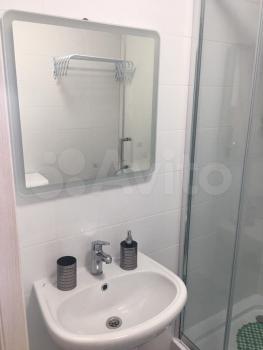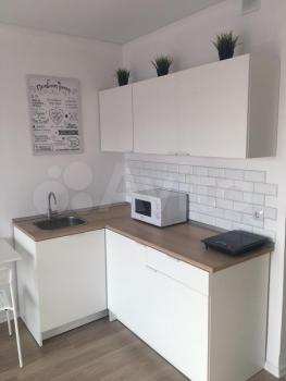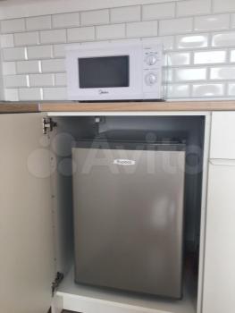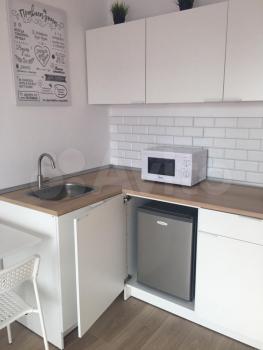 В студии есть встроенная кухня с бытовой техникой (холодильник, плита, микроволновая печь, чайник), раскладной удобный столик с 2 стульями, вместительный 3-х створчатый шкаф с зеркалами, раскладной диван, письменный столик, прихожая с зеркалом, ЖК телевизор, стиральная машина, санузел, душевая кабинка .