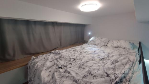Студия полностью меблирована - двуспальная кровать с изголовьем, многочисленные места хранения в виде шкафов, гардеробной и большим объемом для вещей под подиумом, барный стул и обеденная зона - рабочее место. Смарт ТВ 43 дюйма.