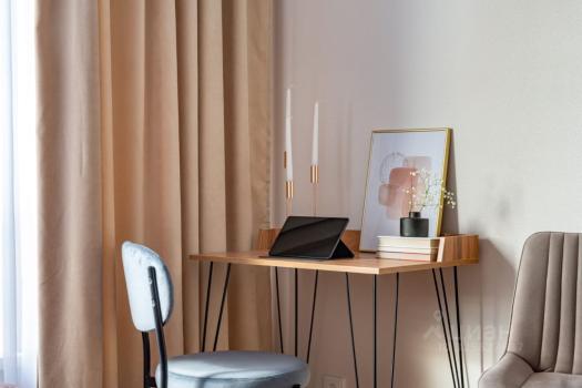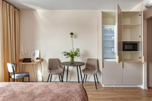 Студия обладает дизайнерским ремонтом, что создаёт особую атмосферу и комфорт. В квартире есть вся необходимая мебель как на кухне, так и в комнате. Из техники вы найдёте кондиционер, холодильник, посудомоечную и стиральную машины, а также телевизор. Санузел совмещённый, оборудован душевой кабиной.