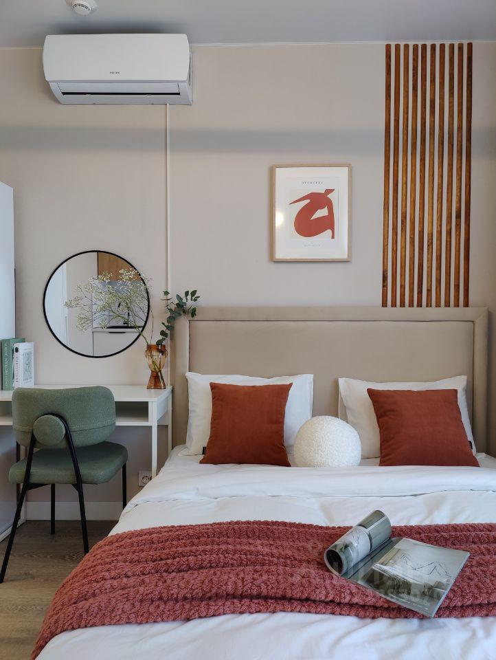 В квартире есть все для комфортного проживания: стиральная машинка, сплит-система, холодильник, смарт-ТВ, варочная панель, чайник, СВЧ, кухонный гарнитур (с посудой и столовыми приборами), утюг, гладильная доска и совмещенный санузел. Диван-кровать с ортопедическим матрасом и ящиком для хранения вещей. Евро ремонт. Входная дверь с зеркалом на внутренней стороне.