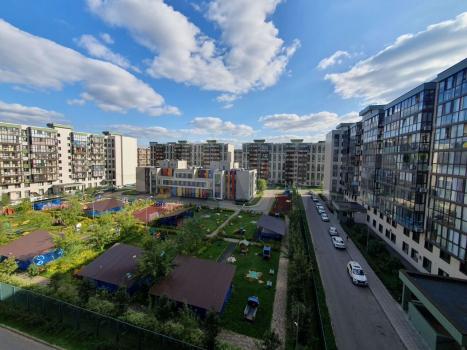 Студия 25 м2 с лоджией в ЖК Эко Бунино с отделкой, мебелью и техникой. Второй этаж, вид на детскую п...