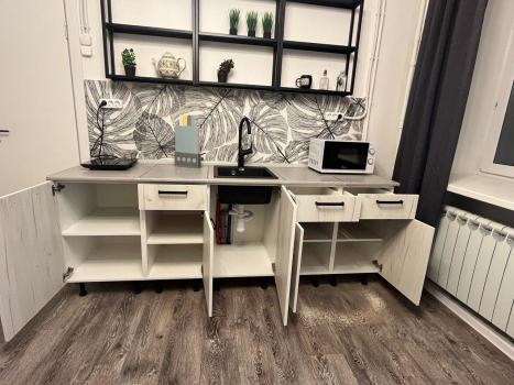 В квартире есть вся необходимая мебель и техника для проживания: настенная вешалка, шкаф на 4 секции, пуф, стол, стулья, встроенная кухня с варочной поверхностью и сухожаровым шкафом и вытяжкой. Раскладной прямой диван, спальное место 200х140. Смарт-телевизор. Микроволновая печь. Холодильник. Чайник. Утюг, гладильная доска и сушилка для белья. Кондиционер. Жалюзи. Роутер (интернет-провайдер гранлайн). В санузле полноразмерная ванная, унитаз инсталляция, стиральная машинка, шкафчик, полотенцесушитель.