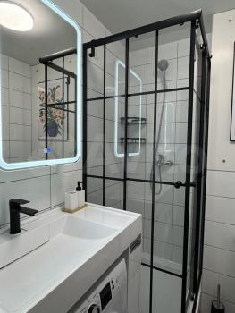 Совмещенный санузел оснащен душевой кабиной, стиральной машиной и зеркальным шкафом. Также есть гладильная доска, утюг, инвентарь для уборки.