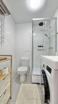 продуманная кухонная зона, много мест для хранения. В квартире есть все необходимое: кровать с подъемным механизмом и ортопедическим матрасом, посудомоечная машина, холодильник, СВЧ, чайник, фильтр