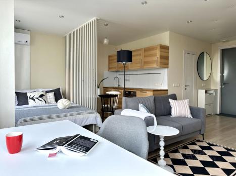 Просторная светлая функциональная дизайнерская студия в ЖК "Сити Бэй". В этой квартире у Вас точно не возникнет ощущения маленького гостиничного номера, перекрытого наполовину кроватью, куда зашли чтобы переночевать.