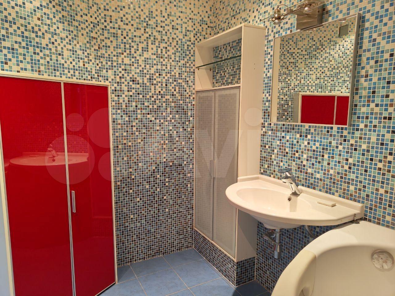 ⁃ Ванная комната выполнена по индивидуальному дизайну с продуманной дополнительной системой хранения и стиральной машиной.