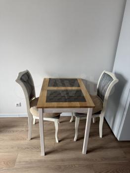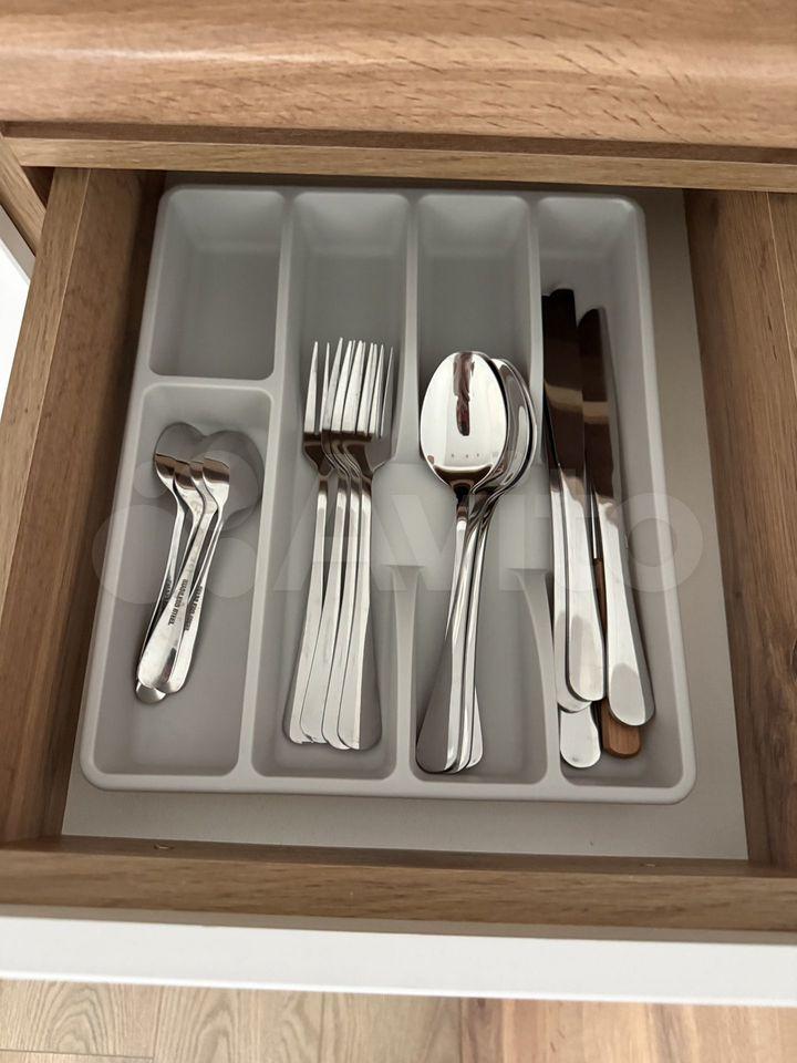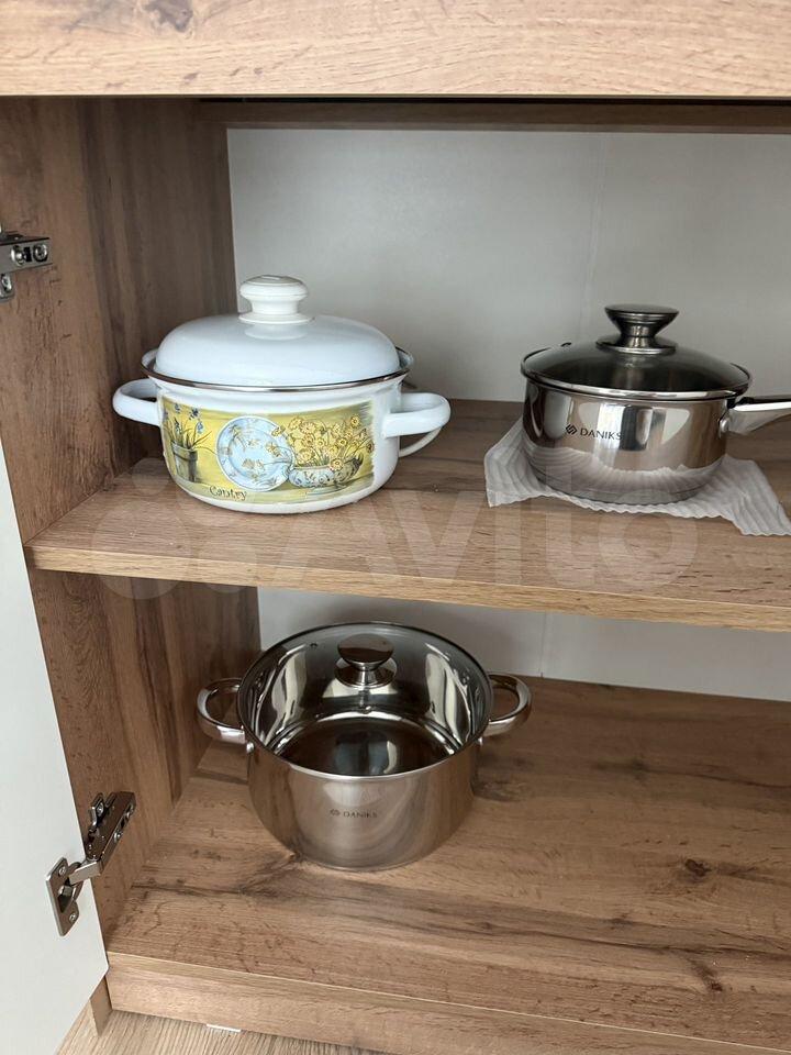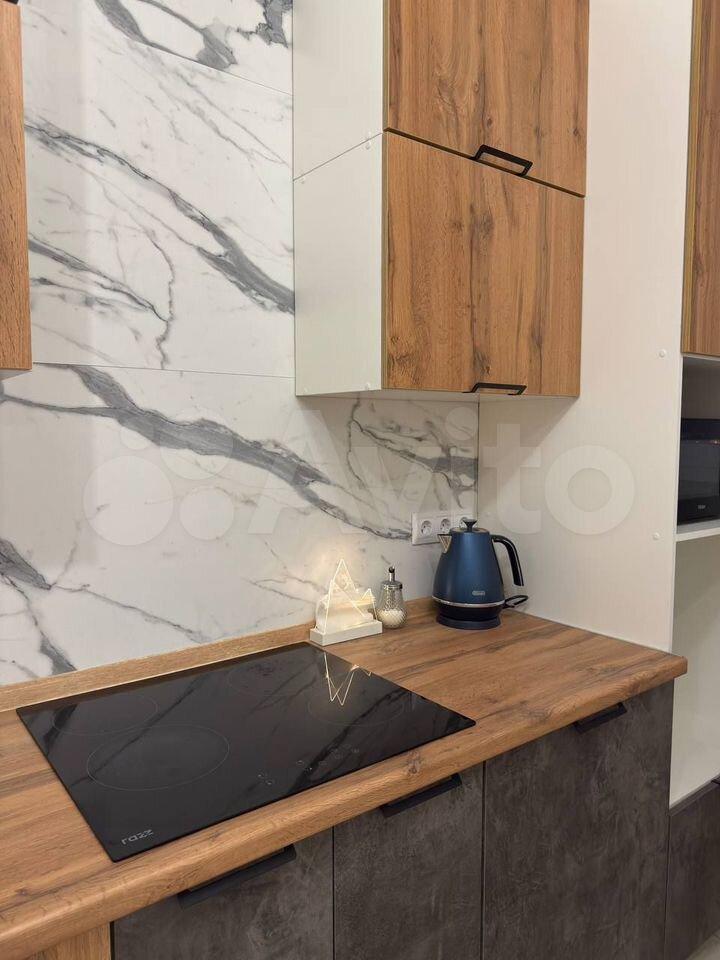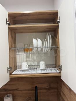 Кухня полностью укомплектована: кофемашина, варочная панель, духовка, холодильник, микроволновка, вытяжка, чайник, посуда, столовые приборы.