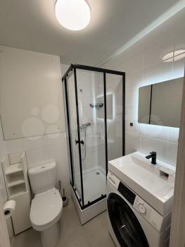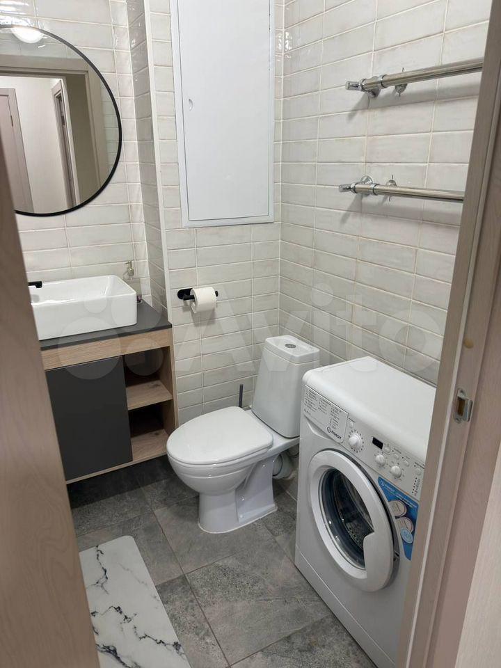 В санузле новая сантехника, теплый пол, стиральная машина и электрический полотенцесушитель.