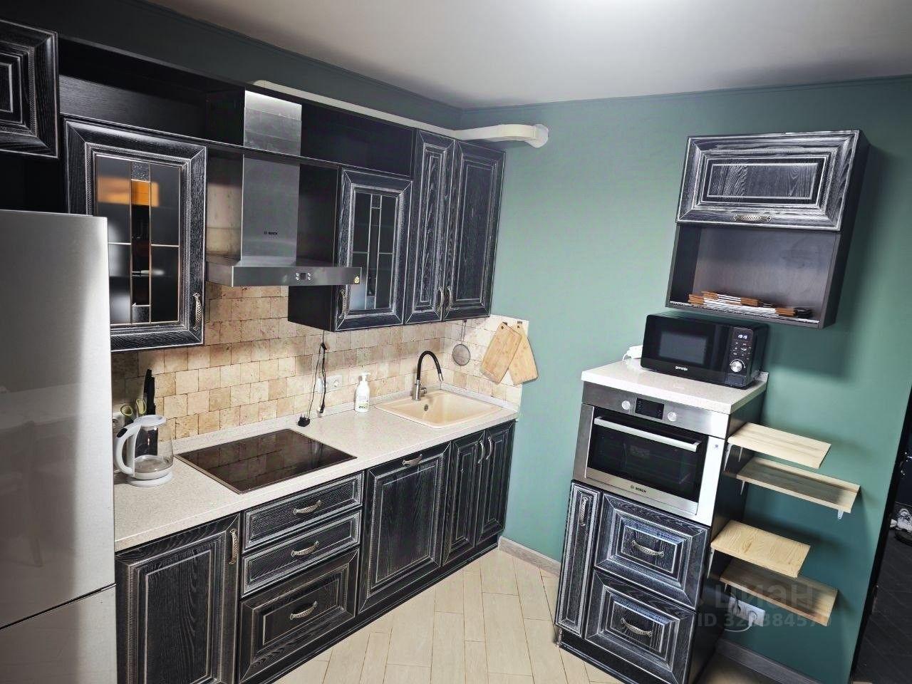 Техника: варочная панель, духовой шкаф, большой холодильник (300 л), стиральная машина, микроволновая печь, чайник