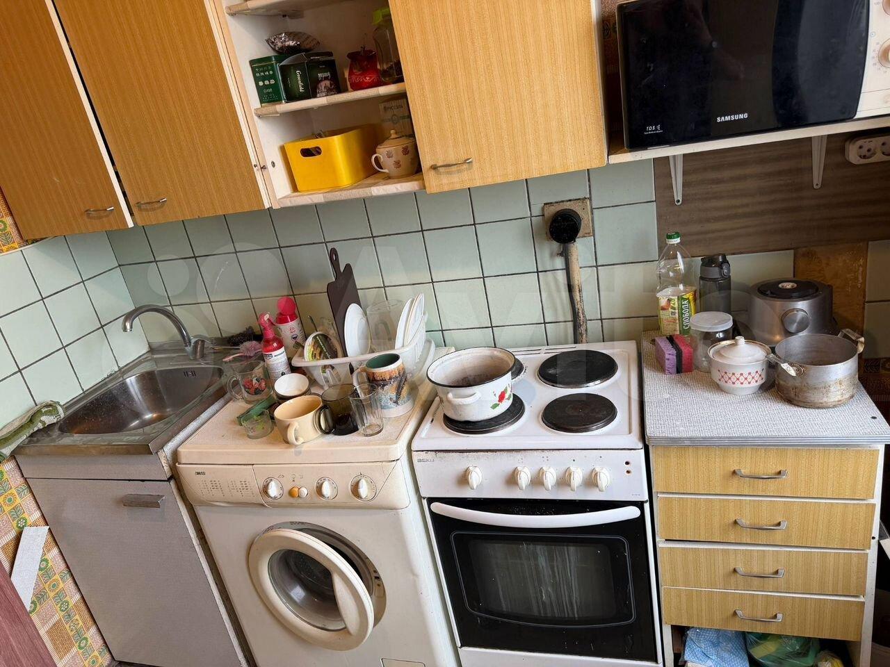 Мебель, стиральная машина, холодильник. Окна во двор .