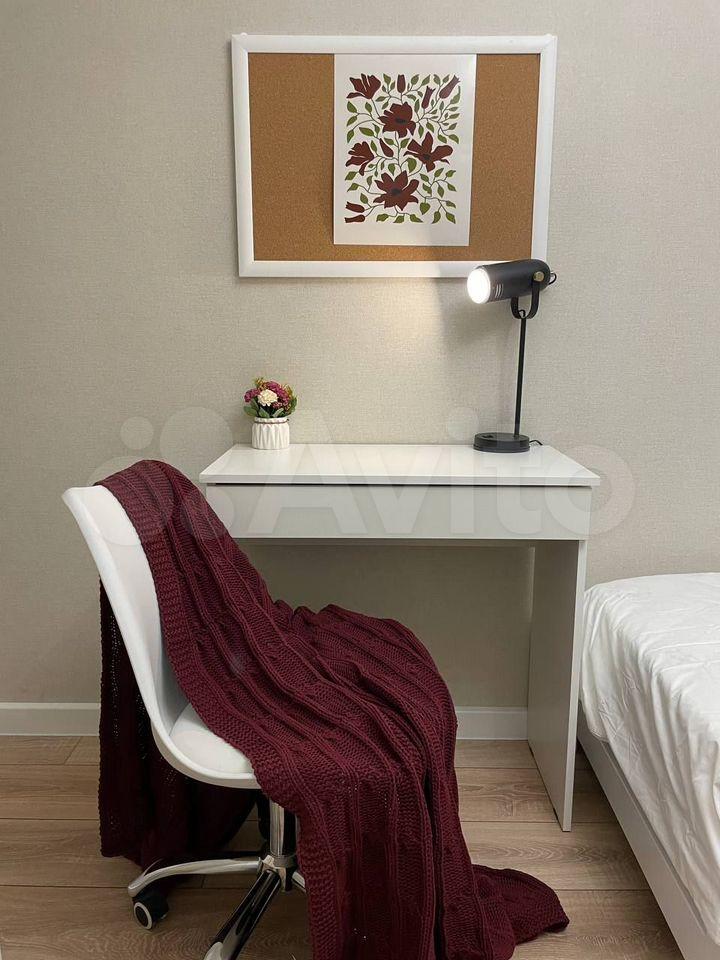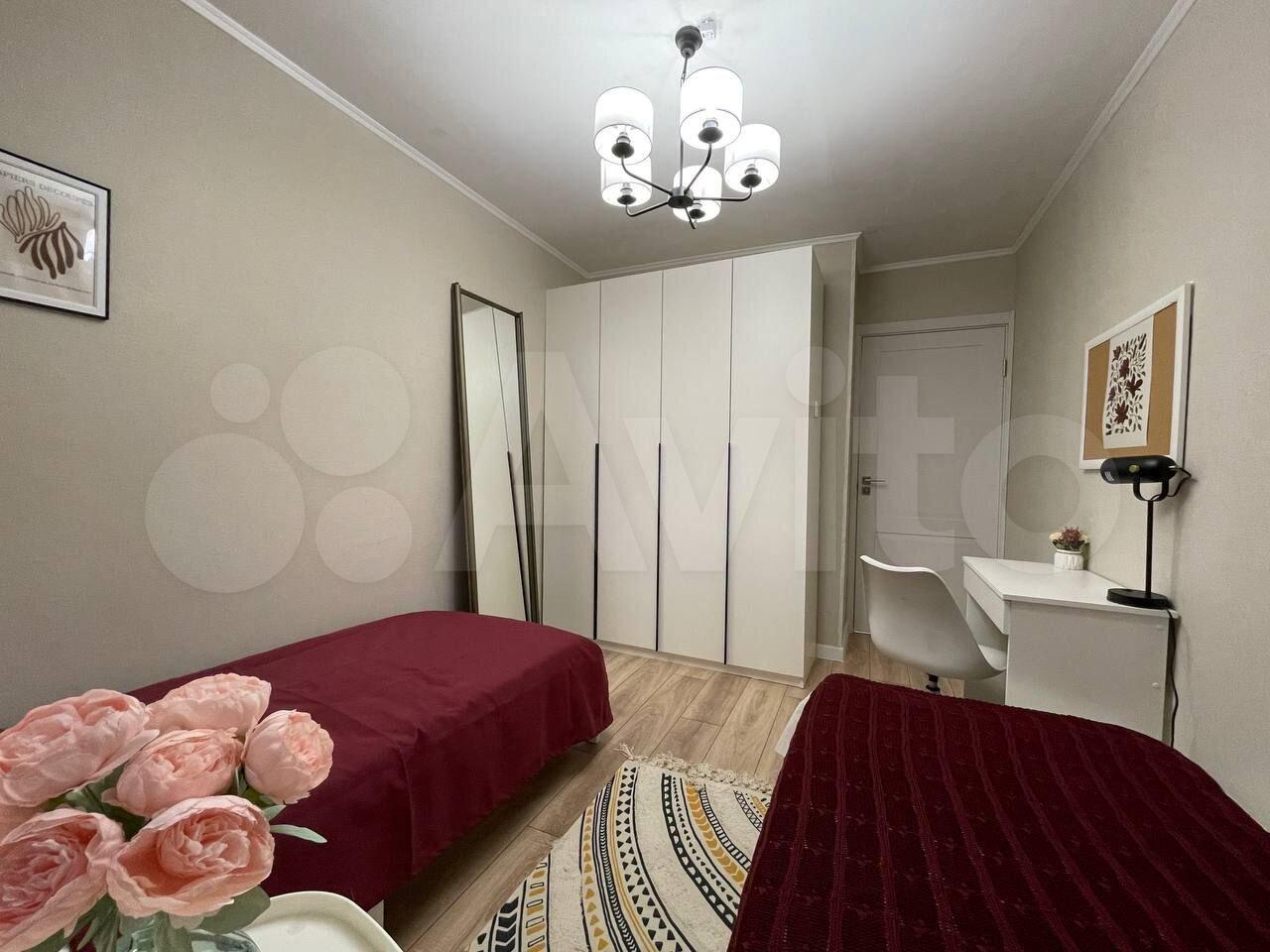 В спальнях новая мебель в светлых тонах. В каждой комнате расположился вместительный шкаф для хранения. Есть место для оборудования рабочей зоны ребенку или себе.