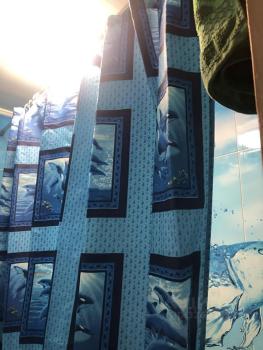 На окнах установлены текстильные жалюзи.