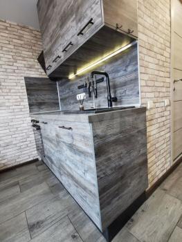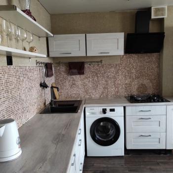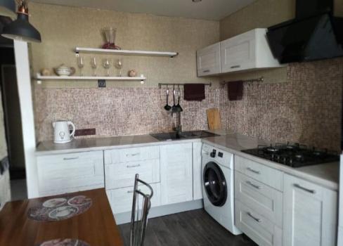 В кухонной зоне установлен качественный гарнитур со встроенным холодильником, духовкой, посудомойкой, микроволновкой и дополнительным освещением рабочей зоны и обеденного стола.