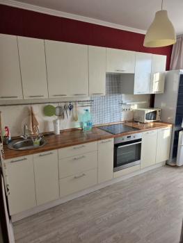 Квартира оснащена всей необходимой бытовой техникой: холодильник, чайник, духовой шкаф, варочная поверхность, телевизор, кондиционер, бризер, стиральная машина.