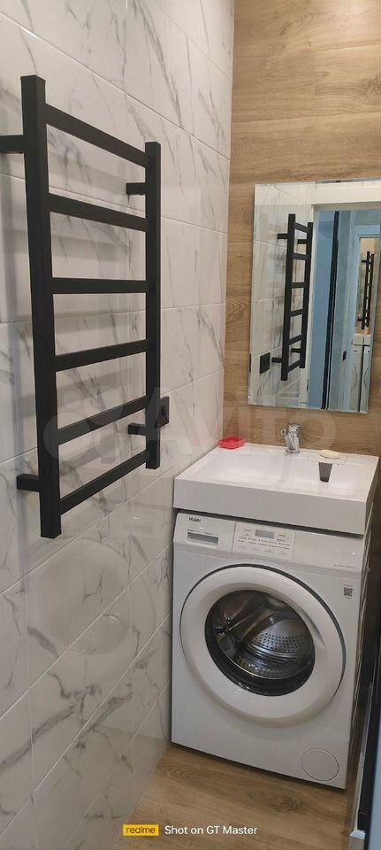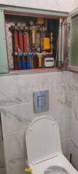 В санузле водонагреватель в коллекторном узле, мини-сушка, датчики протечек. Есть также полноразмерная сушка, утюг, гладильная доска, стремянка