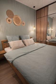 Спальня: Кровать из массива дуба 180см, вместительный шкаф-купе, 2 комплекта постельного белья, подушки, одеяло.