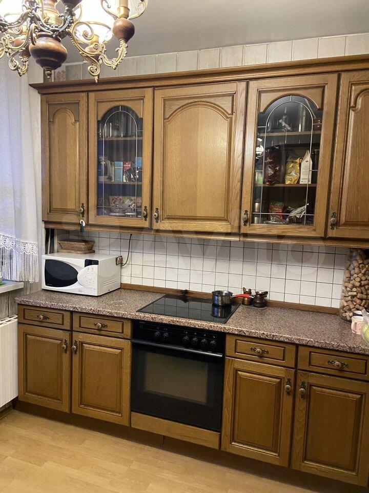 В квартире выполнен косметический ремонт. Есть двуспальная кровать в спальне, раскладной диван в гостиной, а также рабочий стол. Лоджия застеклена, выход на неё — из кухни.