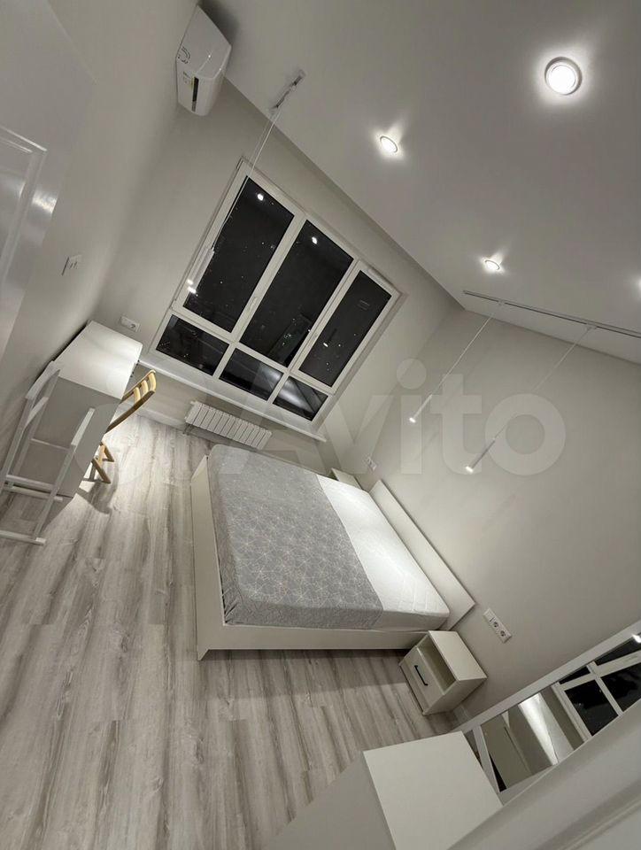 Студия выполнена в современном стиле, с высокими потолками и большими панорамными окнами.